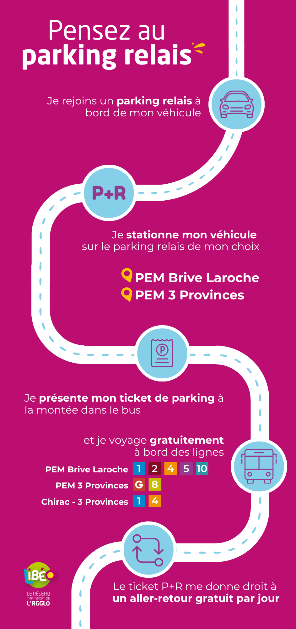 Déposez votre voiture en toute sécurité et montez gratuitement à bord des lignes 1, 2, 4, 5, 8, 10 et la Gaillarde pour rejoindre facilement le centre-ville de Brive, la zone Est de Malemort, le centre hospitalier, la Gare SNCF et même Saint-Pantaléon-de-Larche.